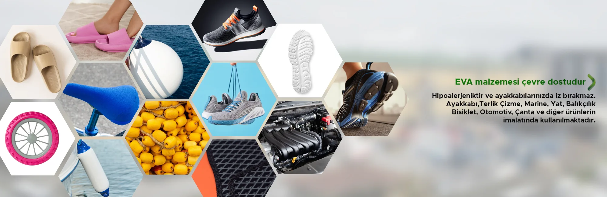 Etilen Vinil Asetattan üretilen EVA, esnek yapısı ve darbelere dayanıklı özelliği ile geniş bir kullanım alanına sahiptir. Özel formüle edilen bir ürün olup, talebe göre performans arttırıcı polimerler ve katkıların karışımı ile oluşmaktadır.